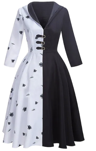 Cruella Costume Set White - Style A- Large print design. dress- cloves and wig included