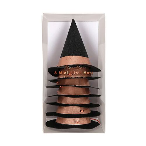 Set of 8 mini witch hats embellished with black glitter and shiny rose gold foil.