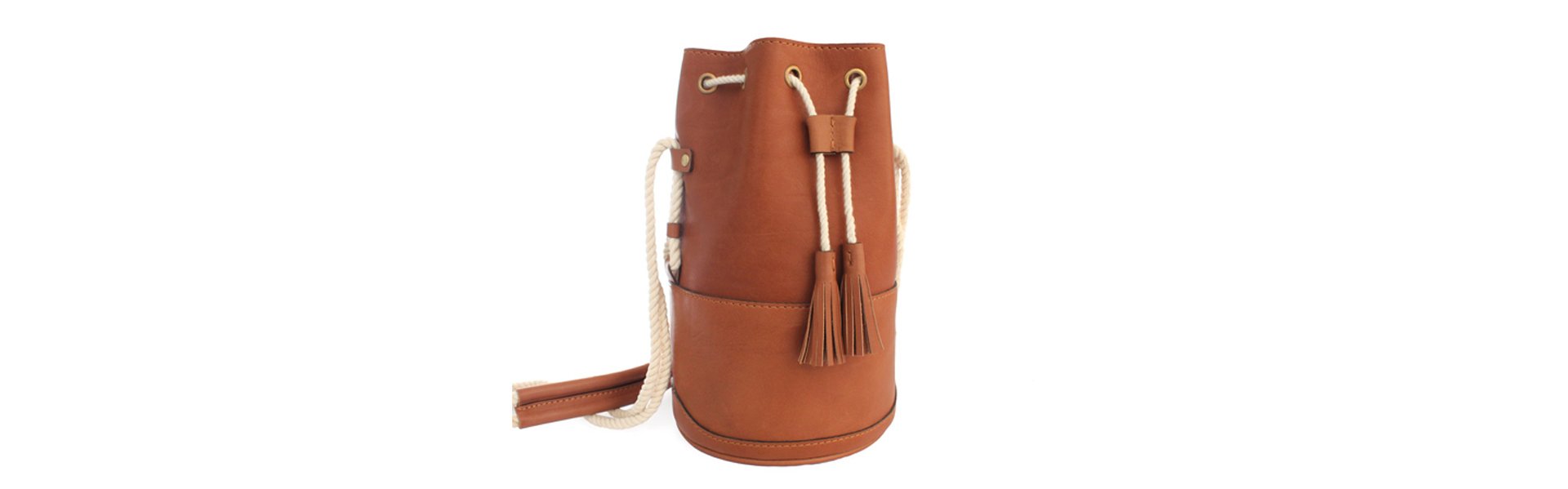 Handcrafted entirely out of genuine leather, with an attached cotton rope shoulder strap and woven leather handle. The bag is fastened by draw-strings and is lined with striped cotton fabric on the inside. Dimensions: 22.8 x 12.7 cm