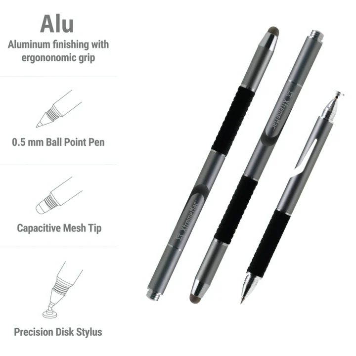 • Rollerball pentip. • Capacitive mesh stylustip. • Precision diskstylus. • Rubberized grooved grip. • Aluminum material. • Lightweight and comfortable.